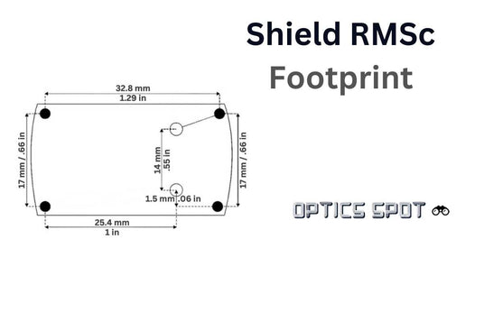 Shield RMSc fotavtryck består av fyra socklar i hörnen av siktet och två skruvhål i bakre delen av siktet.
