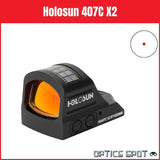 HS407C är ett öppet reflexoptiskt sikte designat för pistoltillämpningar. Funktioner inkluderar Holosuns Super LED med upp till 50k timmars batteritid, endast 2MOA punkt, Solar Failsafe och Shake Awake.