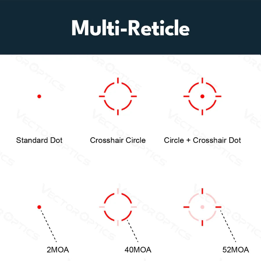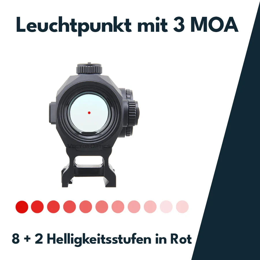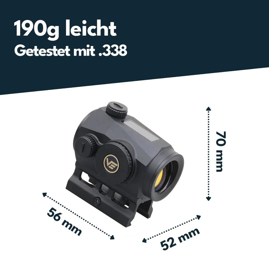 Den erbjuder också tre valbara riktmedel, en rörelsesensor (automatisk avstängning efter 2 minuters inaktivitet, och den slås på igen så snart optiken rörs), samt totalt tio ljusstyrkenivåer (inklusive 2 för mörkerseende).